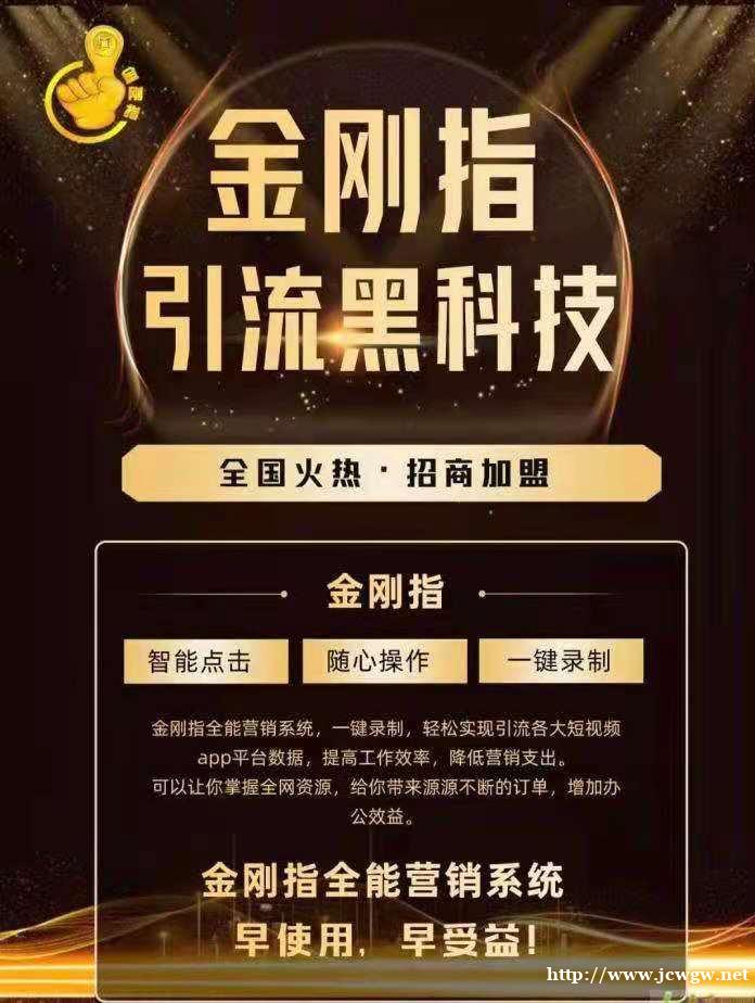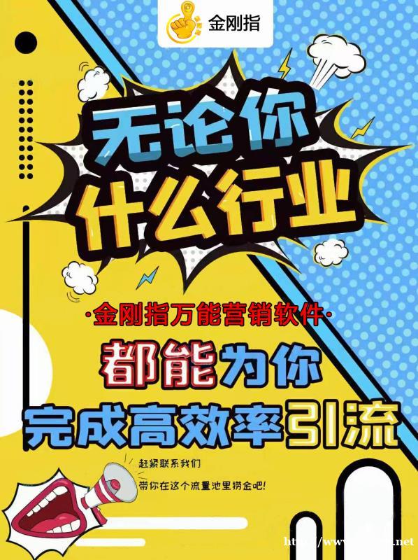 金刚指拓客引流工具是打开财富之门的金钥匙,提升各大短视频平台的转化率,总部公司做到数据资源回收,小型工作室(2~3个人)按照我们的方式用软件去找数据,我们回收数据进行转化,一个手机一天3个数据.100个手机就是300个数据,一个数据50块钱,300个数据就是15000块钱,领成本快速裂变!金刚指项目低投入,高回报,加盟金刚指工作室、一定让你赚的盆满钵满